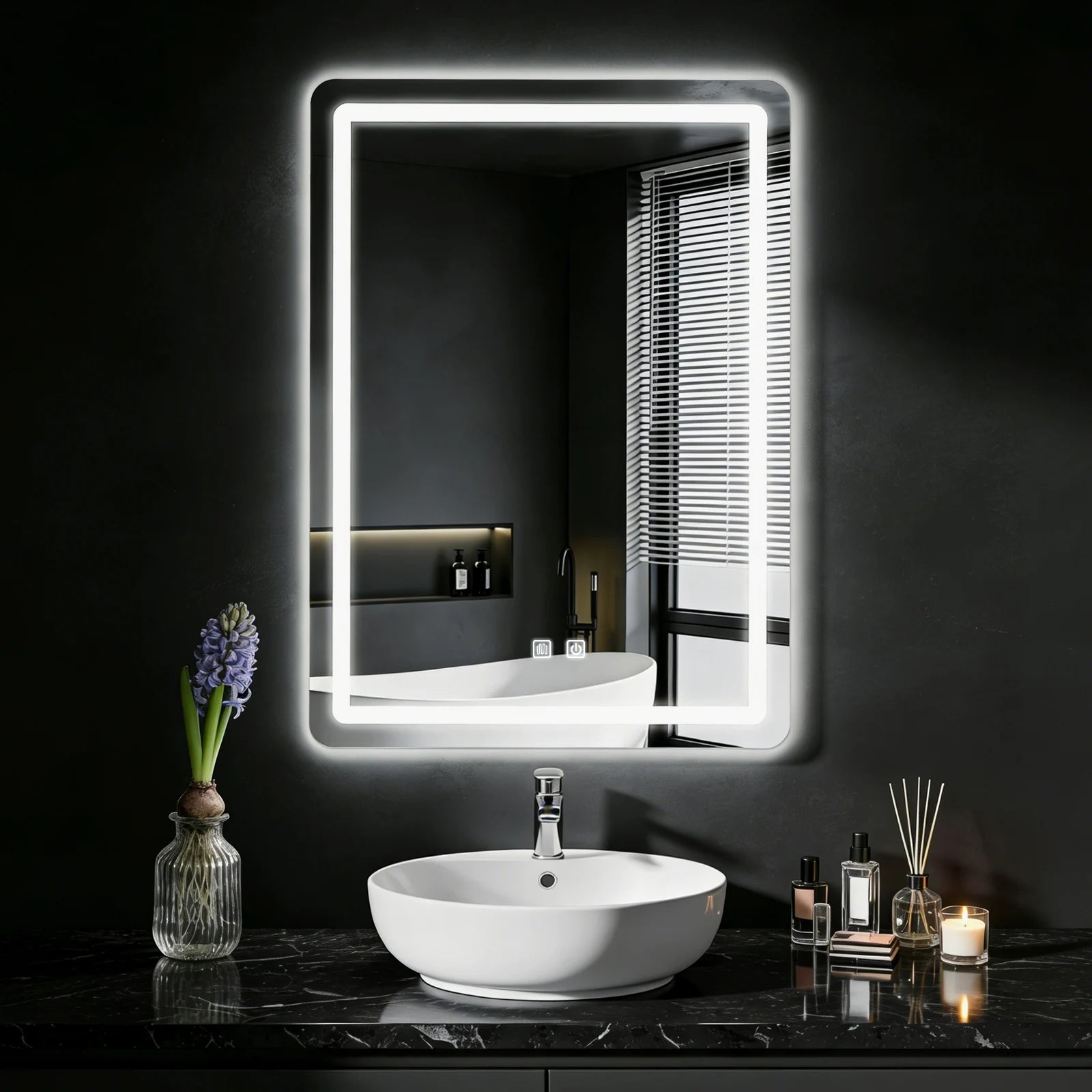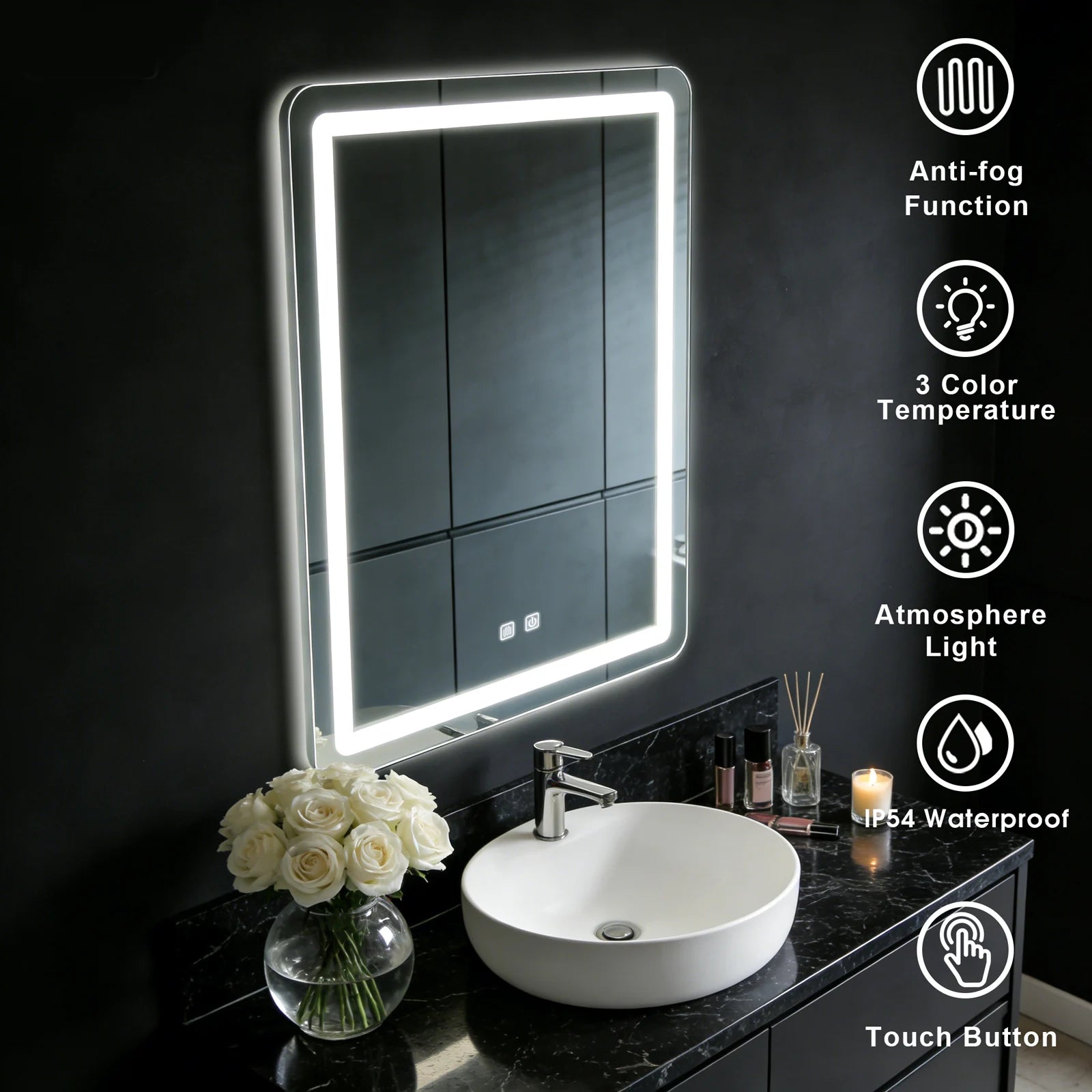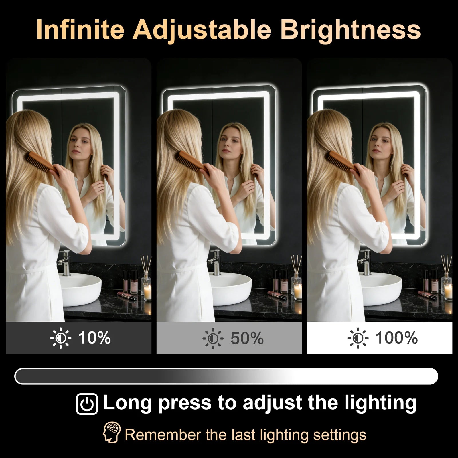 [Dimmable 3 Colors]The temperature and brightness of this light up bathroom mirror can be adjusted. Short press the light button to turn on/off and switch color (3000K warm, 4000K natural, 6000K white). Long press to adjust brightness from 10% to 100%.