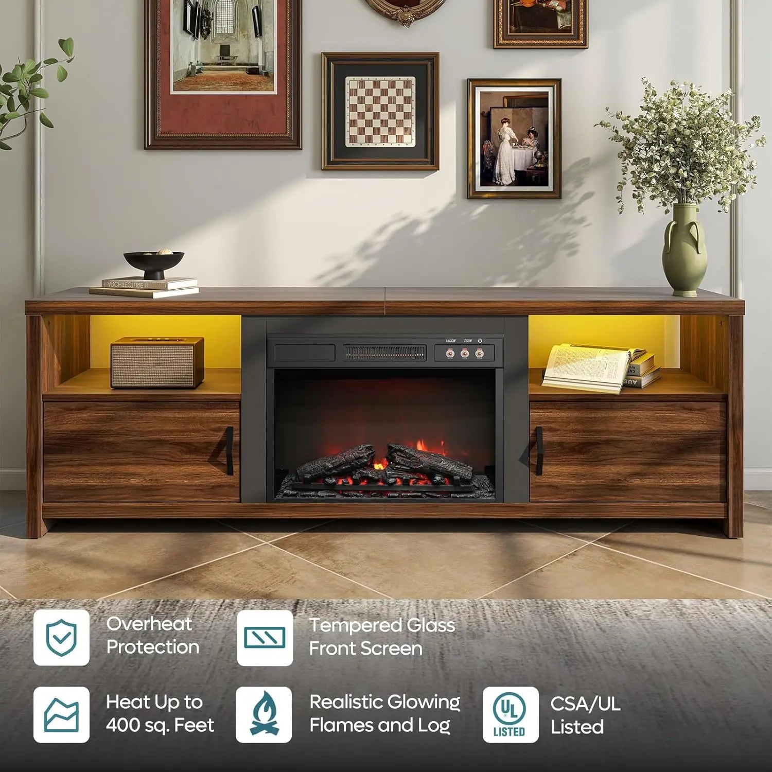 23" Retro Button Fireplace TV Stand:Lifelike match-burn flames keep dancing even when the heat is off, and with a quick 750/1500 W toggle you can warm living room or bedroom in minutes—or stay cool and still bask in the fire-lit glow.