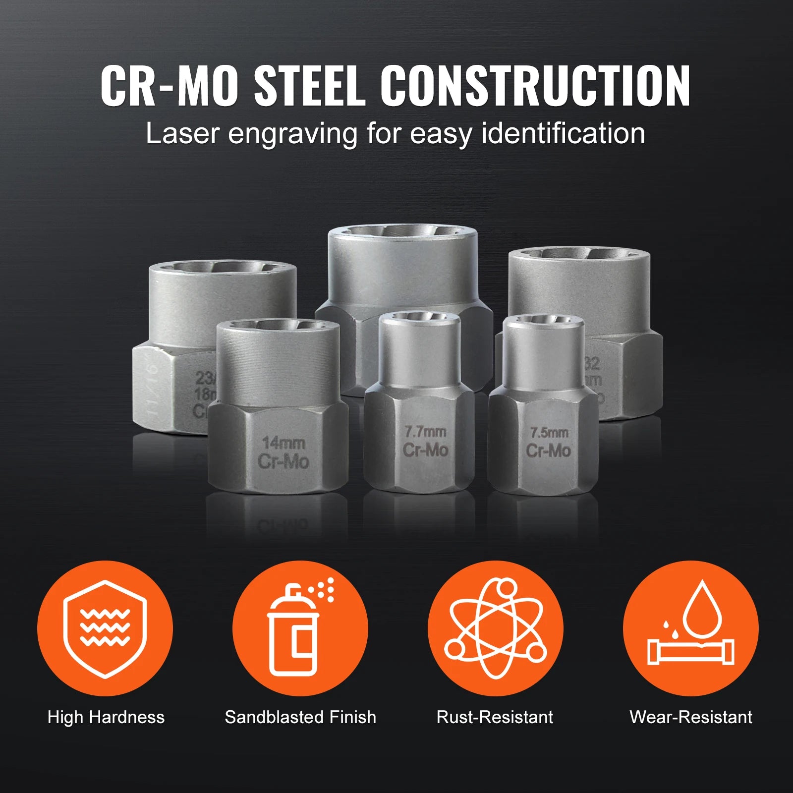 Cr-Mo Bolt Extractors: The broken bolt extractors are made from high-hardness, robust Cr-Mo steel material, and they are resistant to breakage. The sandblasted surface enhances wear resistance and rust resistance. The extractors are laser-engraved with sizes for easy identification and quick selection.