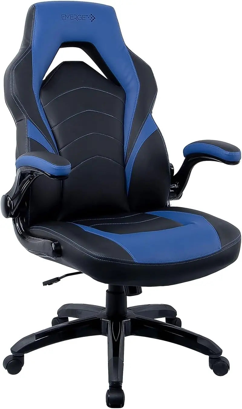 - Black and blue faux leather gaming chair with color contrast stitching and blue color blocks
